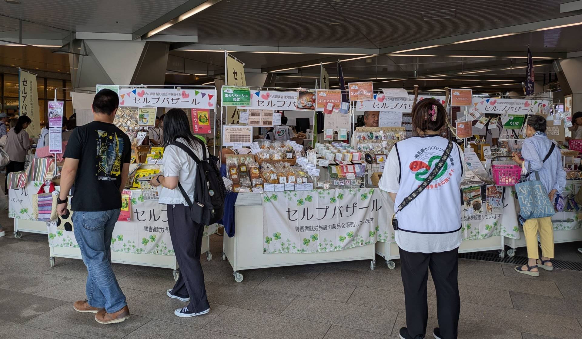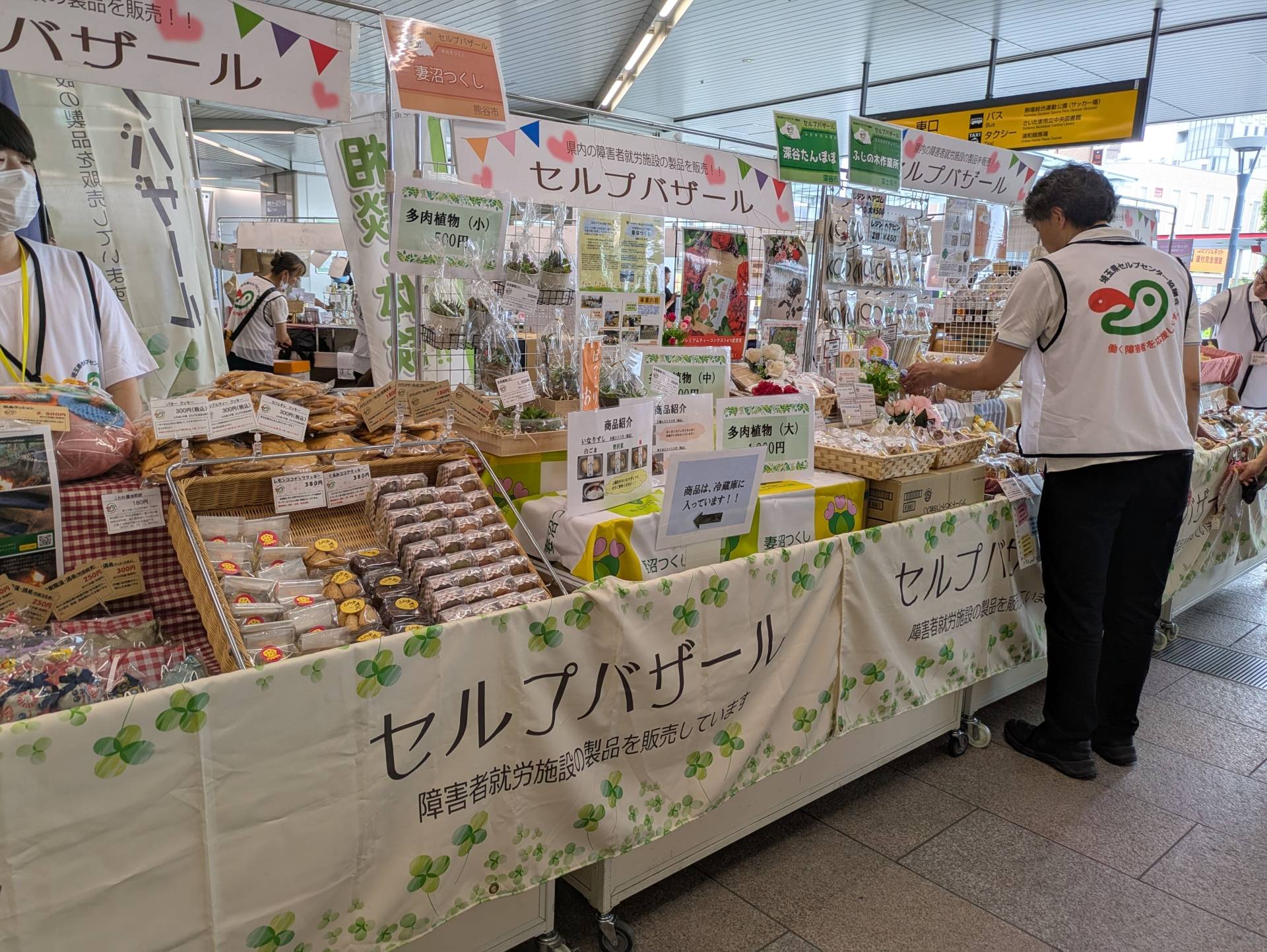 7月3日(木)・4日(金)の2日間、浦和駅で「セルプバザールin浦和駅コンコース販売」を開催しました。今年度の参加事業所数は26事業所。毎年この時期での開催は、猛暑の中どのくらいのお客様が商品を手に取り購入していただけるのか、商品のラインナップや個数、レイアウト等を試行錯誤しながら販売しています。今年も昨年に引き続き猛暑となりましたが、毎年参加している事業所は、昨年の状況を研究し、暑い中でも喜んでもらえる商品の開発や安心してご購入できるよう表示等の工夫を行いながら販売していました。最近では、食品の他に雑貨の売れ行きも好調です。実用的なものから装飾品として生活を潤してくれる物等、多種多様な商品が並んでいました。どれもカラフルな色使いで販売会全体をにぎわせてくれています。
