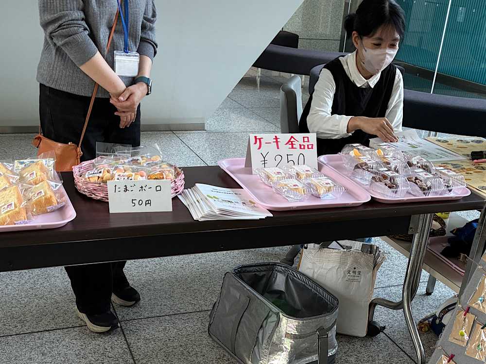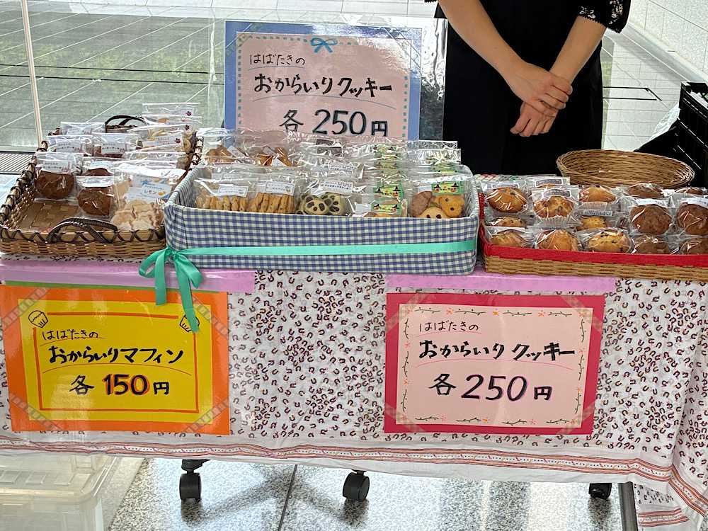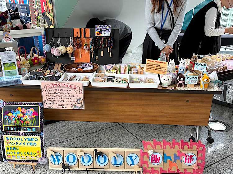 今回は、虹(飯能市)、ウーリー飯能(飯能市)、所沢市立キャンバス(所沢市)、はばたき(比企郡鳩山町)の4事業所が参加しました。虹はケーキ・クッキー・卵ボーロ、ウーリー飯能は人形・カゴ・ボールペンを販売しました。キャンバスは野菜・お茶類・せっけん・巾着を、はばたきはクッキー・マフィン・チャームを販売しました。